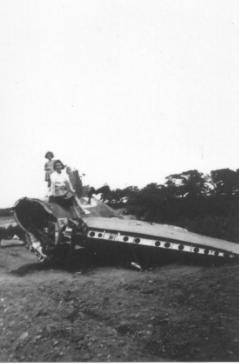 Pauvres garçons : deux étaient morts dans l'appareil, un autre fut trouvé au village de la Tuilerie, commune de St Philbert, les deux jambes fracassées(3). Un autre (celui auquel j'ai parlé) et auquel Gilbert CHANSON donna une vigoureuse poignée de main , était blessé au bras et à la jambe. Un autre que la maladresse de B.P. fit prendre. Un autre qui fut vendu (quelle horreur) par H. et P.G., WORD qui fut capturé vers la garoterie (village de St Philbert), 2 ou 3 autres qui grâce à des complicités parvinrent à se sauver. Les blessés furent l'objet d'une grande ovation à St Philbert et à Legé où ils ne séjournèrent que quelques heures. Depuis, l'aviateur serait décédé à ce qu'il s'est dit. Le fuselage du libérator primitivement était tombé dans une vigne. La photo a été prise après son déplacement.